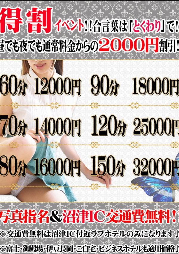 | 所属店舗 | 沼津発 人妻デリヘル お蝶婦人 |